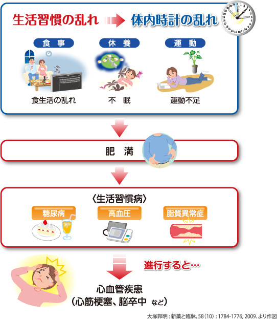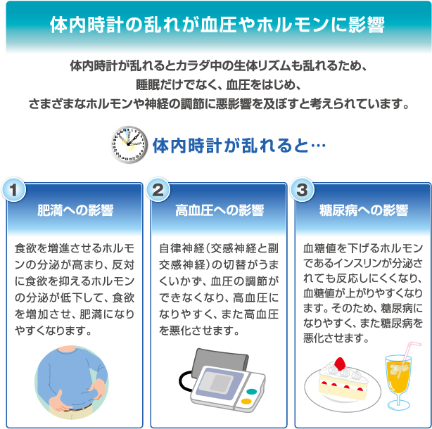 つまり、不眠は、食生活の乱れや運動不足と同様に、生活習慣病を引き起こす引き金のひとつとなるおそれがある、本当は注意しなければならない症状なのです。 不眠の原因のひとつには「体内時計の乱れ」があります。近年、体内時計に関する研究が進み、「体内時計の乱れ」は不眠の原因となるだけでなく、さまざまな病気に悪影響を及ぼすことがわかってきました。