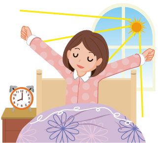 起床時刻の乱れは体内時計のリズムの乱れのもとです。睡眠覚醒のリズムを崩さないように、休日もほぼ決まった時刻に起床することが理想的です。体内時計を乱さないように、休日の寝坊も2時間までにしましょう。